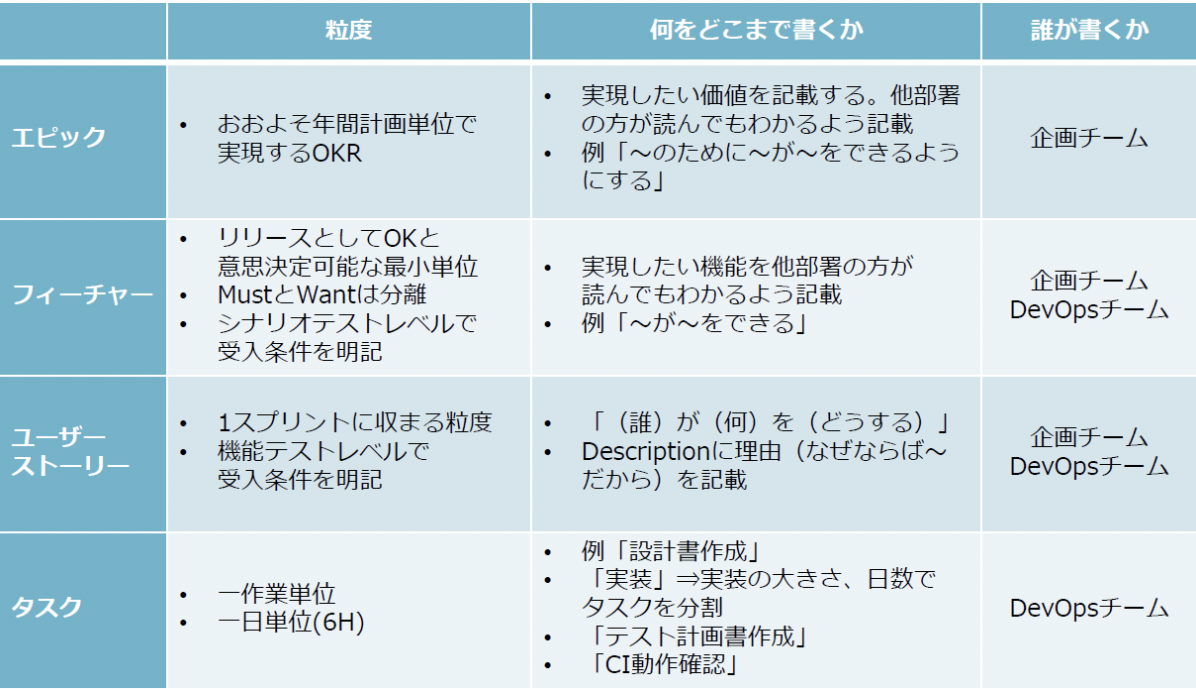 エピックは上記のタスクやストーリーを一定のジャンルでグルーピングしたようなもので、例えば、上記のバックログのうち、iPhone 端末対応と Android 端末対応は「モバイル対応」というエピックでカテゴリ分けできます。 エピックとストーリーの使い分けは難しく、必ずしも使い分ける必要はないと思っていますが、一言でいうと、エピック=大きなストーリーだと思っています。 エピックで分類して、なおかつエピックの進捗具合を共有することで、開発部門以外の人たち(例えば、営業や企画部門、役員の方など)にはよりわかりやすくなるメリットがあるかと思います。